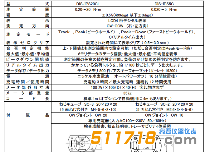 “测量模式”、“测量单位”、“值/小值/平均值”显示可切换测量单位多可保存5组上下限等设置800个内存数据大约每 1/180 秒实时输出包括用于测量静态拧紧工具的螺丝立方体或固定附件可免费下载数据采集软件