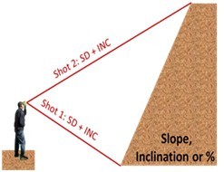 测量模式: 水平距离、垂直距离、斜距和倾斜角(或百分比斜率)